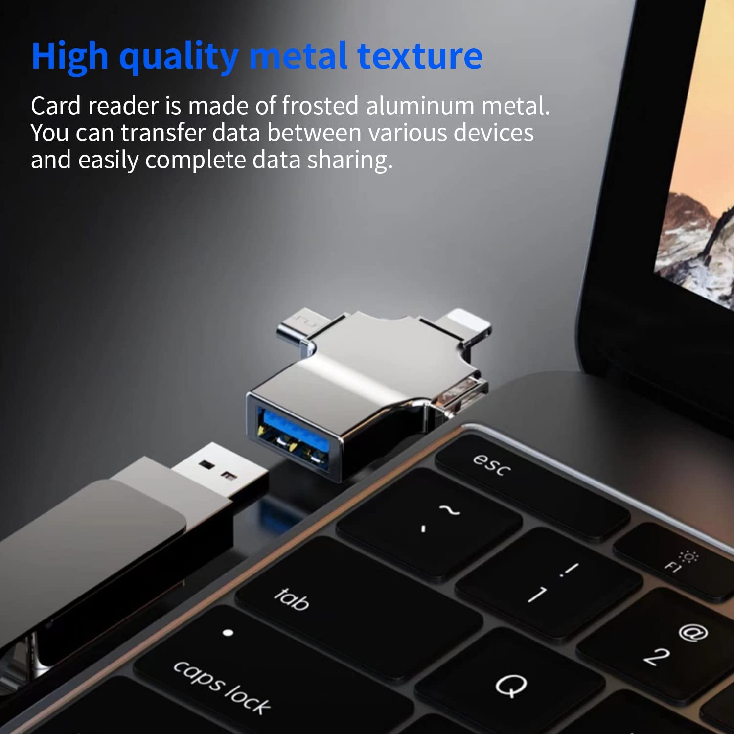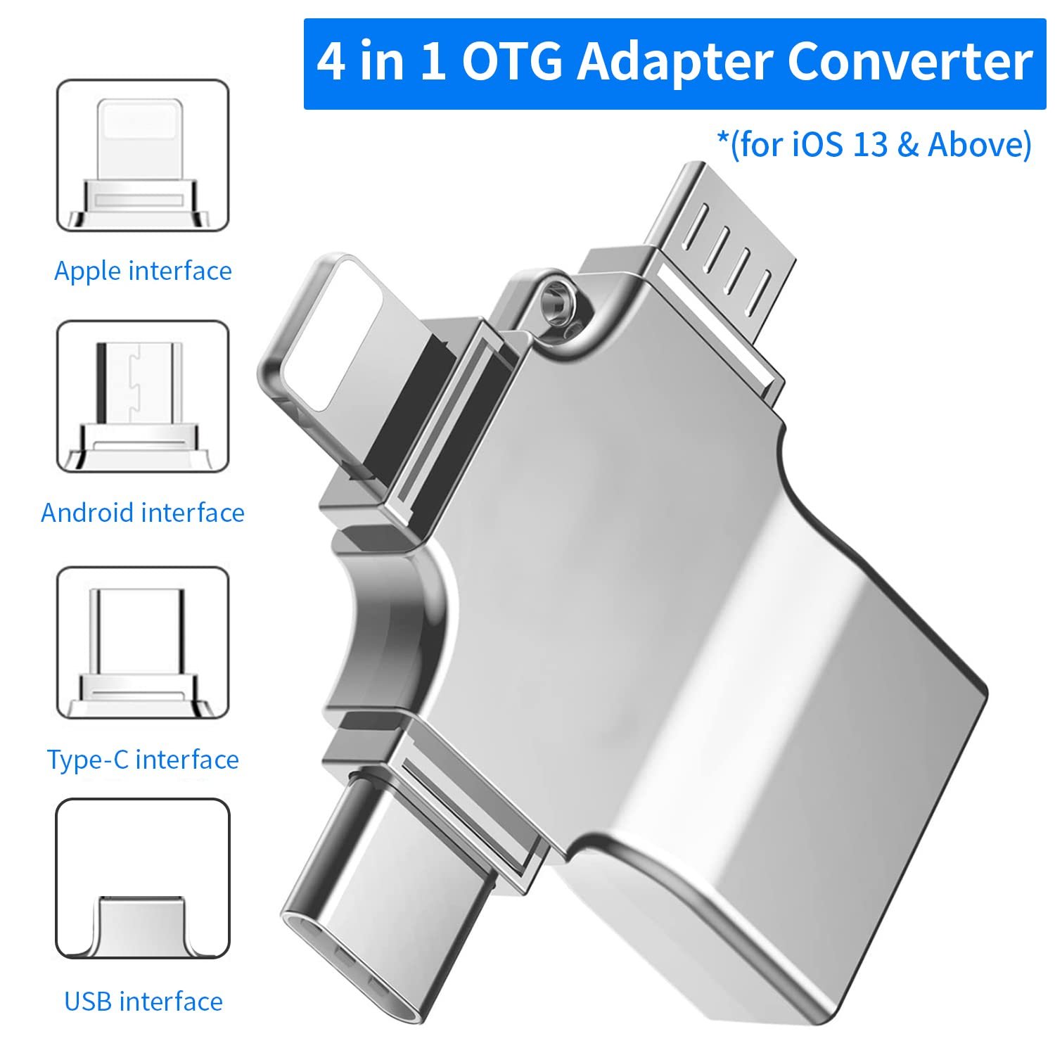 This adapter includes four ports: a Lightning port for iOS devices, a USB Type-C port for newer Android devices, a Micro USB port for older Android devices, and a standard USB Type-A port. This allows you to connect a wide range of devices, from USB flash drives to external hard drives, to your mobile devices.