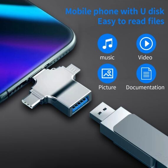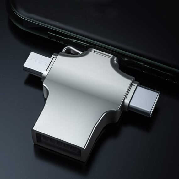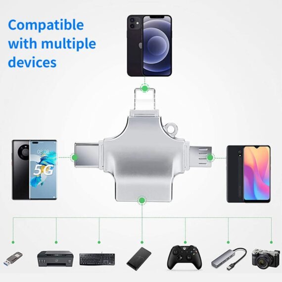 This adapter includes four ports: a Lightning port for iOS devices, a USB Type-C port for newer Android devices, a Micro USB port for older Android devices, and a standard USB Type-A port. This allows you to connect a wide range of devices, from USB flash drives to external hard drives, to your mobile devices.